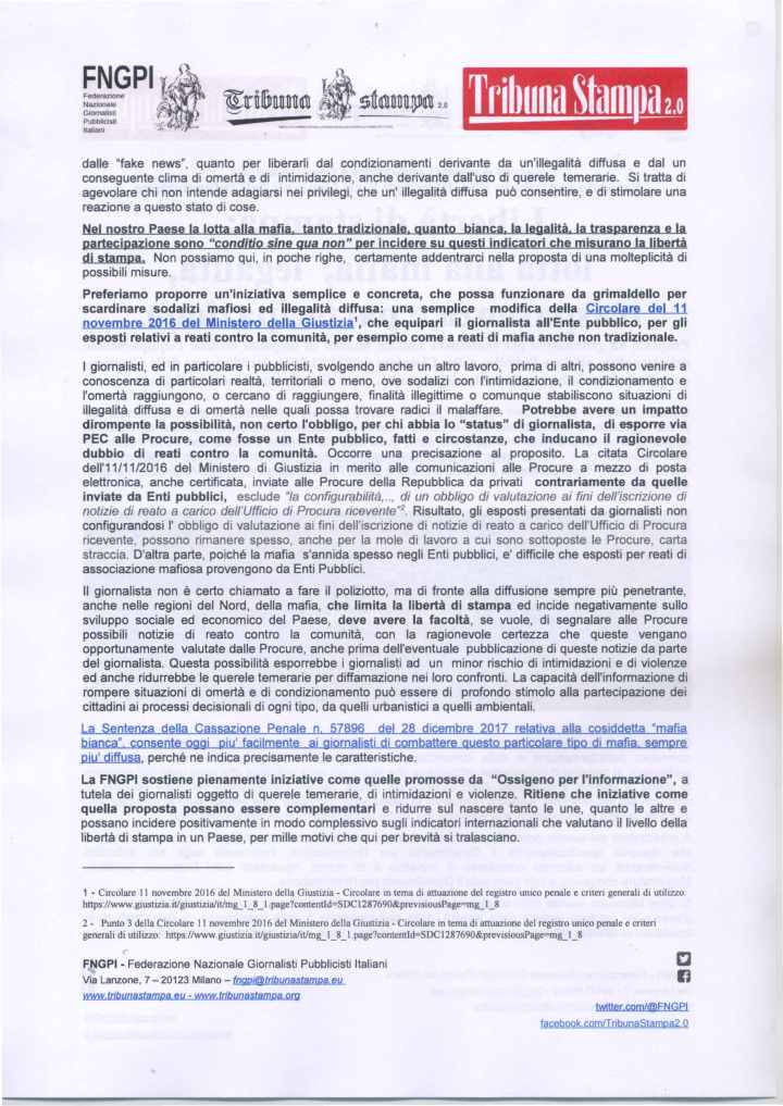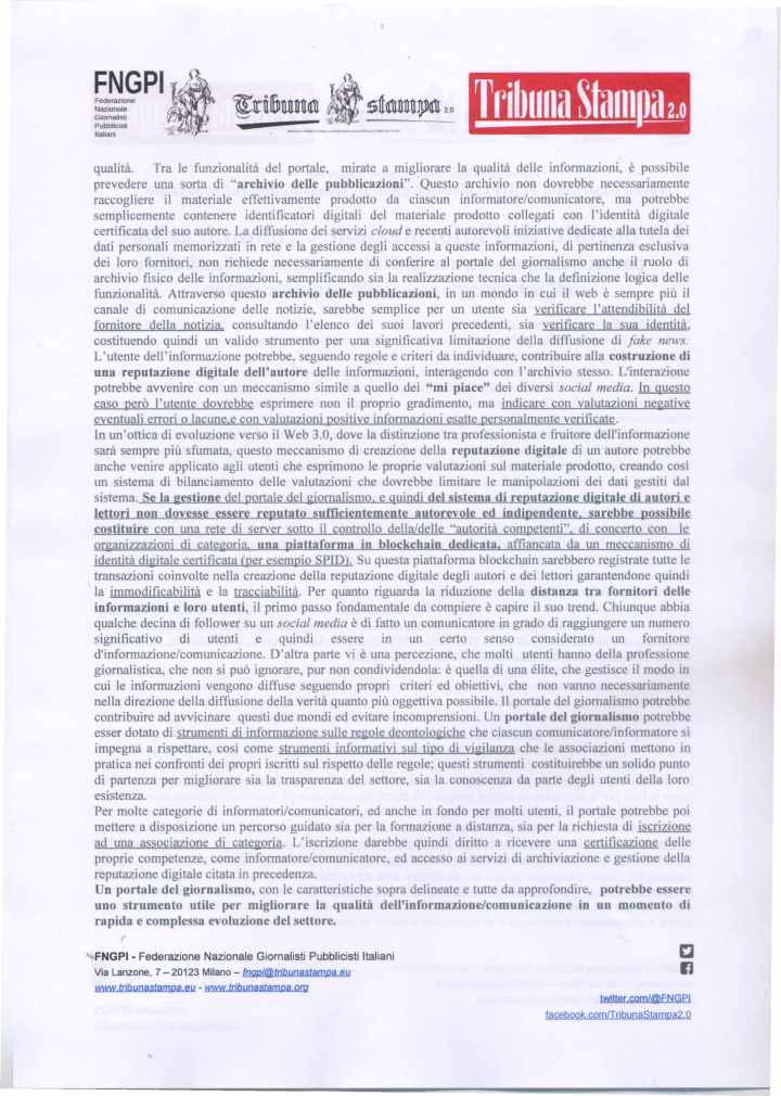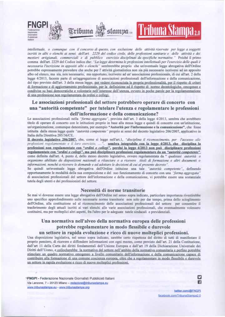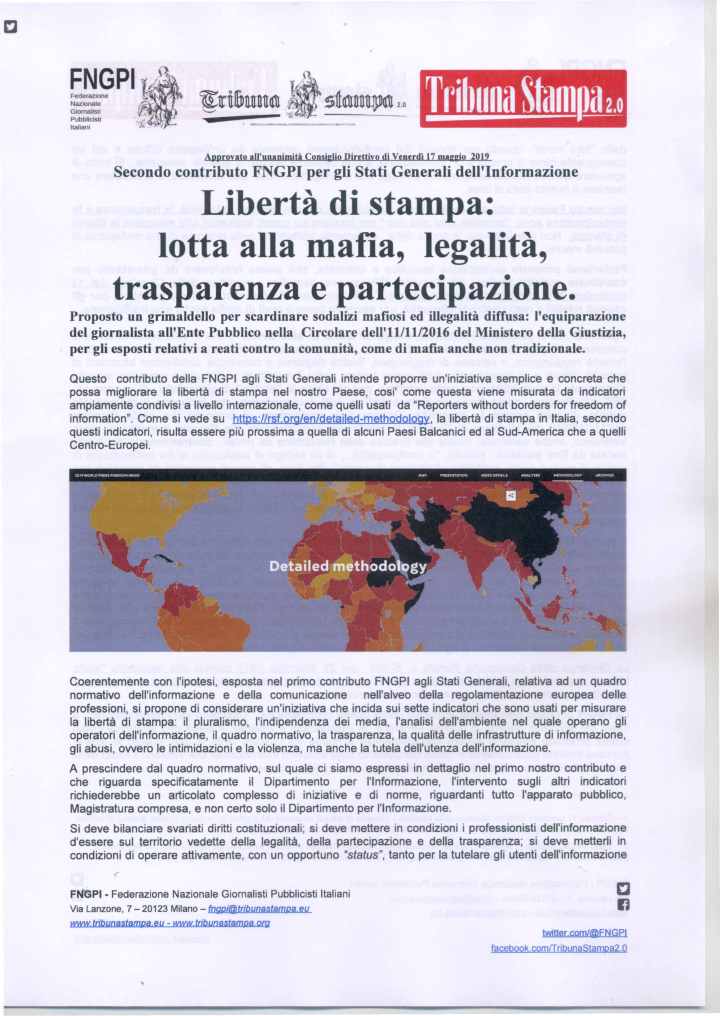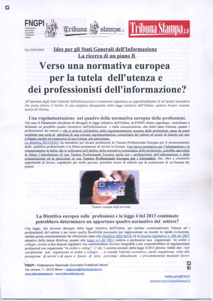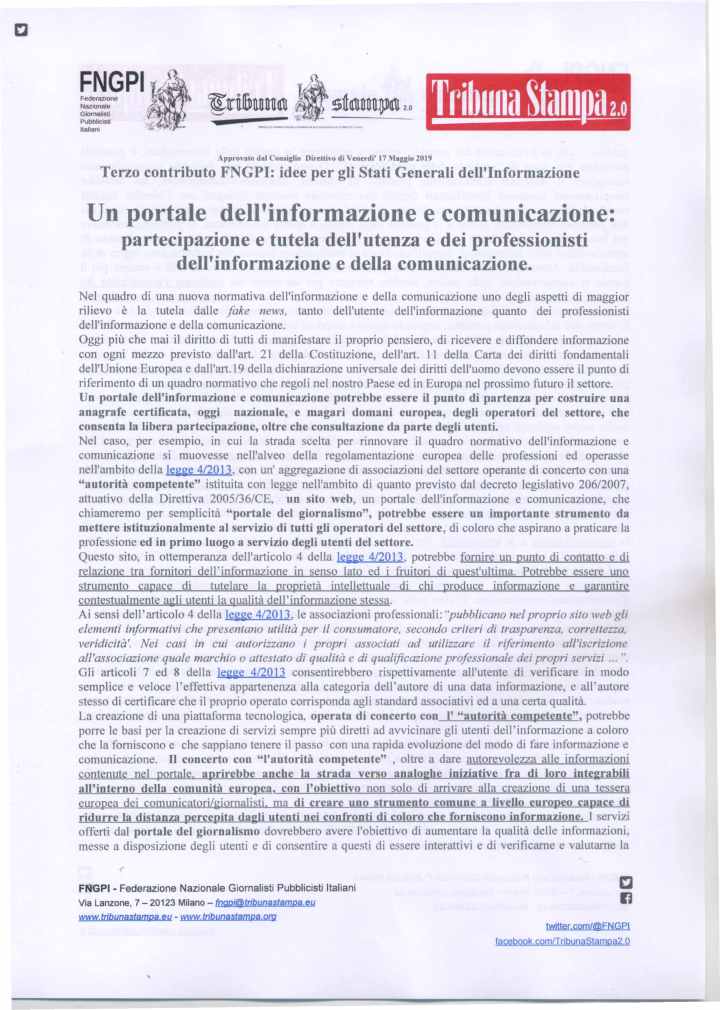 Come è noto la prima fase degli Stati Generali, terminata il 18 maggio scorso, è consistita nella possibilità delle organizzazioni ed anche delle persone singole di proporre delle proprie idee. La Federazione Nazionale Giornalisti Pubblicisti Italiani (FNGPI), della quale Tribuna Stampa, lo storico periodico dei giornalisti pubblicisti, è espressione, ha presentato nella prima fase degli Stati Generali, entro il previsto termine, i seguenti tre contributi:
