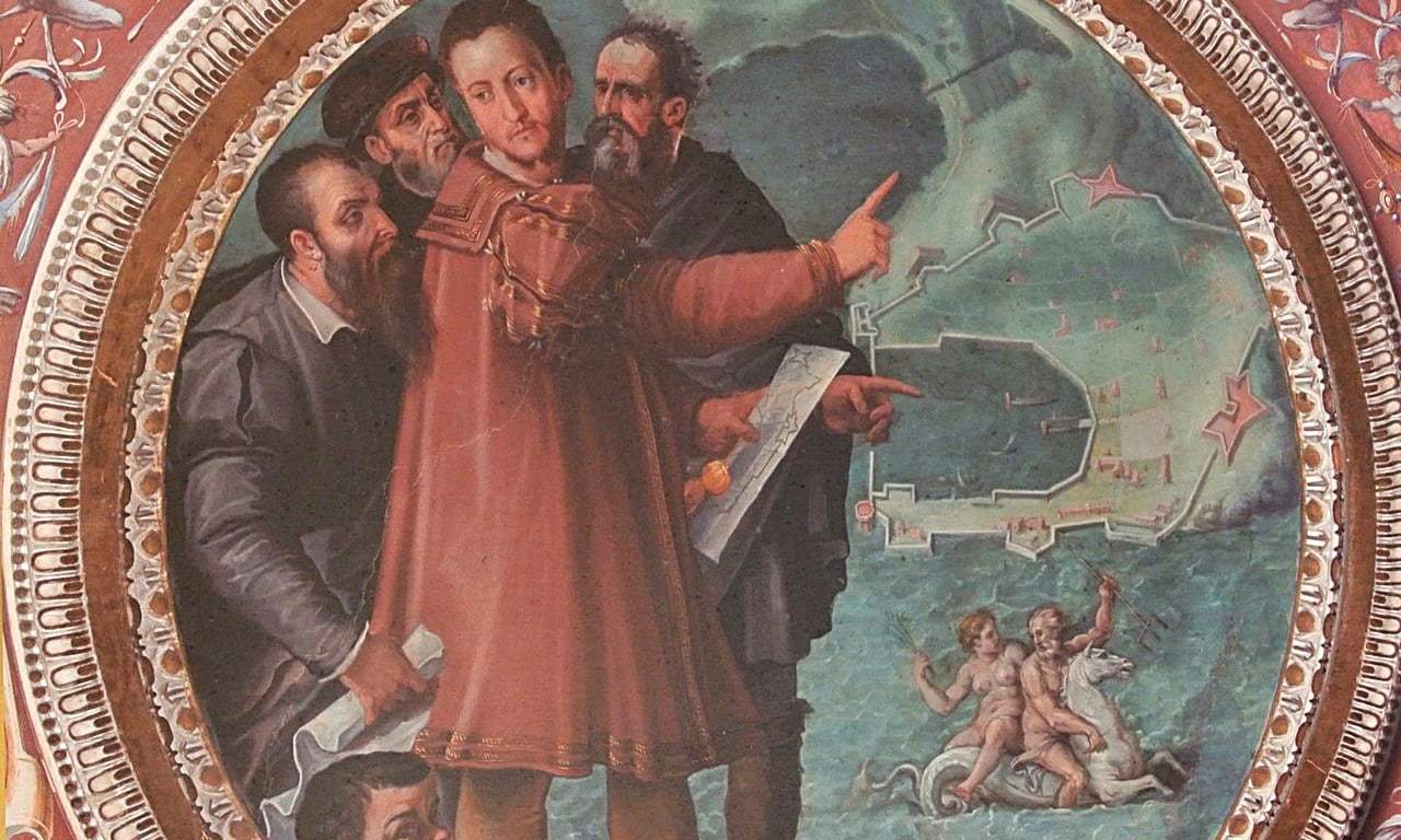 Quest’anno non soltanto si ricordano i cinquecento anni di Leonardo, ma cade il cinquecentesimo anniversario della nascita di Cosimo I de’ Medici, nato a Firenze il 12 giugno 1519, duca della capitale toscana dal 1537 al 1569 e, da quell’anno, primo granduca di Toscana fino al 1574, data della morte. Discendente di Lorenzo de’ Medici e figlio di Giovanni detto delle Bande Nere, condottiero autoritario e deciso, si adoperò per costruire fortificazioni non soltanto utili militarmente, ma simbolo della sua capacità organizzativa e militare, anche disobbediente all’imperatore. Signore anche dell’Isola d’Elba, promosse a Portoferraio consolidamenti protezionistici delle coste toscane ed elbane, soprattutto dalle scorrerie dei pirati, per proteggere ed incrementare i traffici sul Mediterraneo. Erano anni di ammirazione dell’armonia e costruire città ideali era l’obiettivo di molti nobili o signori: nemmeno Cosimo restò immune dalla tendenza e ideò per l’Elba Cosmopoli, cercando di occupare un forte in posizione dominante sul porto per poi costruire la fortificazione sulle rovine di Fabricia di epoca romana e di Ferraja di epoca medievale.