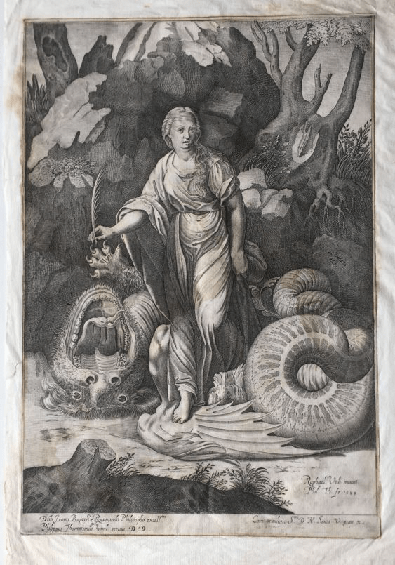 la stampa raffigurante Santa Margherita, incisa nel 1589 da Filippe Thomassin, ispirata da un quadro di Raffaello del 1519.