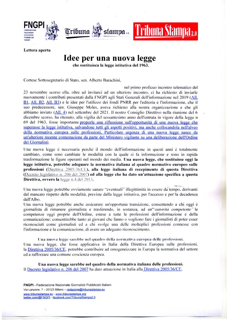 La FNGPI, dopo aver incontrato il 23 novembre scorso il Sottosegretario di Stato all’Informazione ed all’Editoria, sen. Alberto Baracchini ed essere stata invitata ad un secondo incontro, ha predisposto ed inviato al Sottosegretario una “lettera aperta” (leggi qui il testo integrale). che riassume le idee, che saranno oggetto di un dibattito, per modifiche ed approfondimenti, prima dell’incontro con il Sottosegretario. Intendono essere idee per una nuova legge che, superando la legge istitutiva, possa essere in grado di far rappresentare e regolamentare il mondo odierno e futuro dell’informazione, ponendosi nell’alveo della normativa europea delle professioni.
