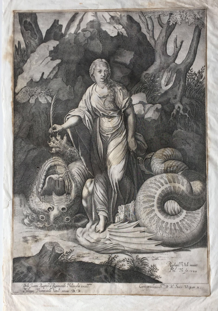 che con una penna doma un drago, simbolo della falsità e dell’ingiustizia.